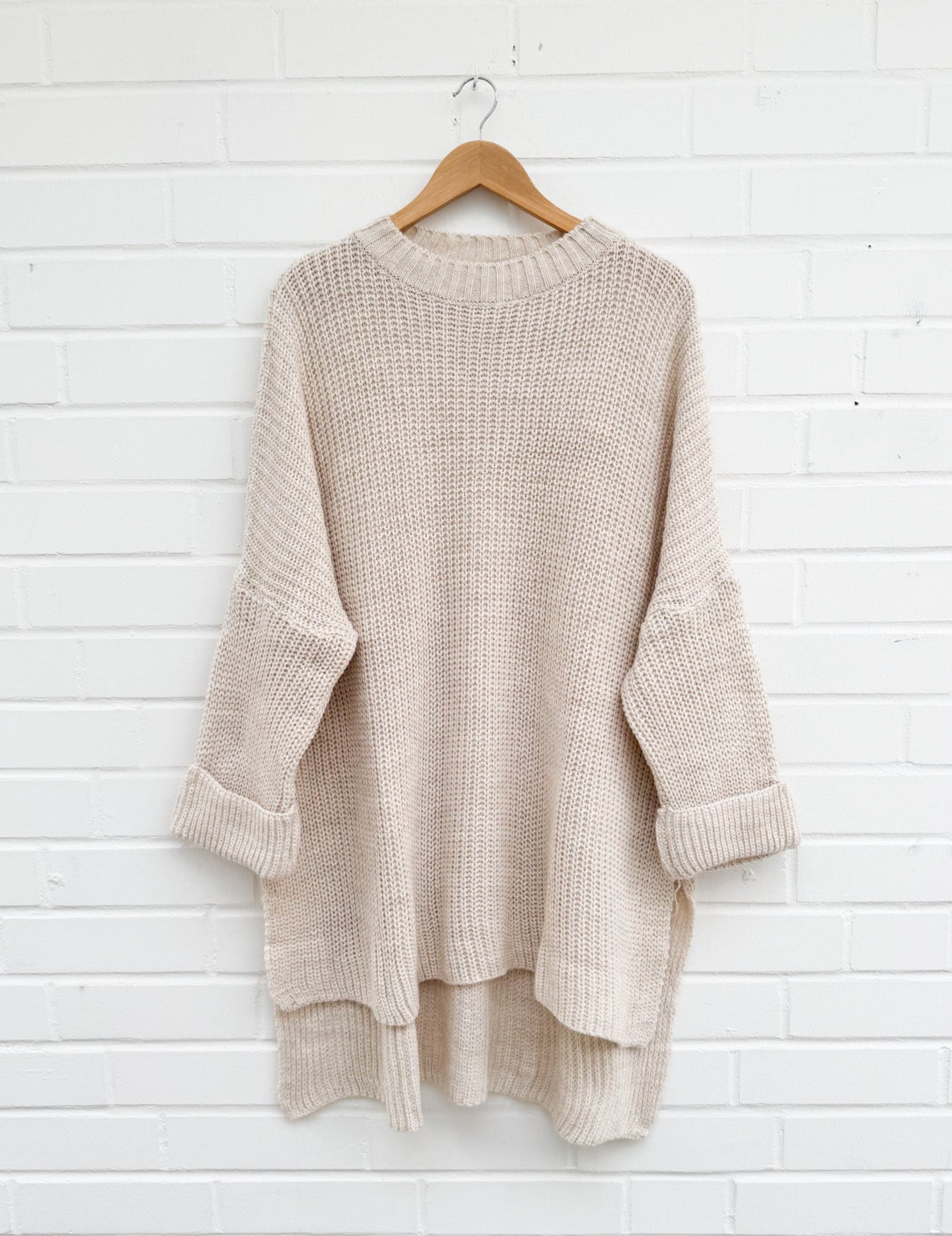 Toller Pullover kam heute in beige und taupe an und sitzt mit 46/48 noch super super locker :) ... Selbst bei der Größe noch lang genug und falls man mag kann man ja auch dass Rückenteil nach vorne drehen :)