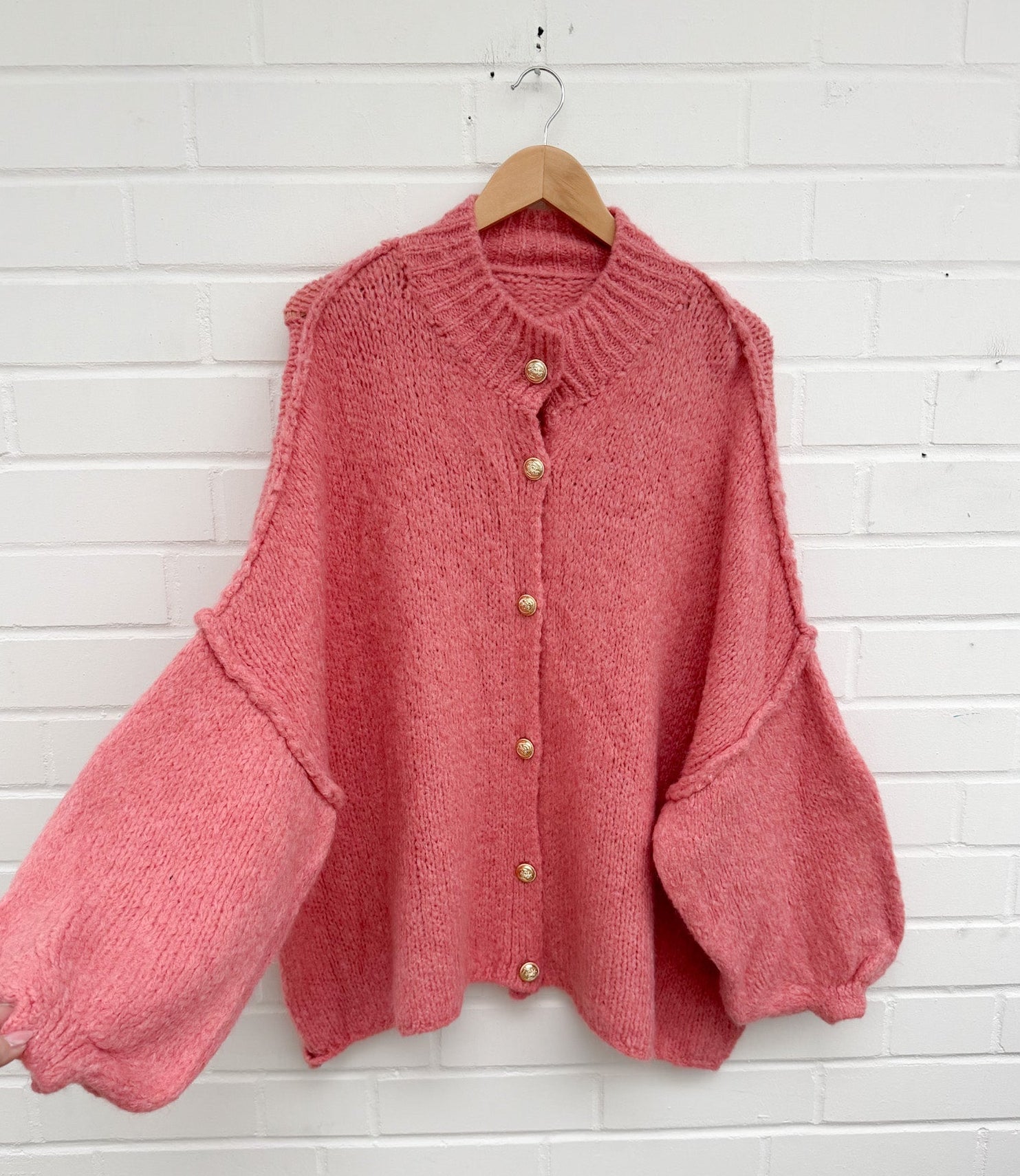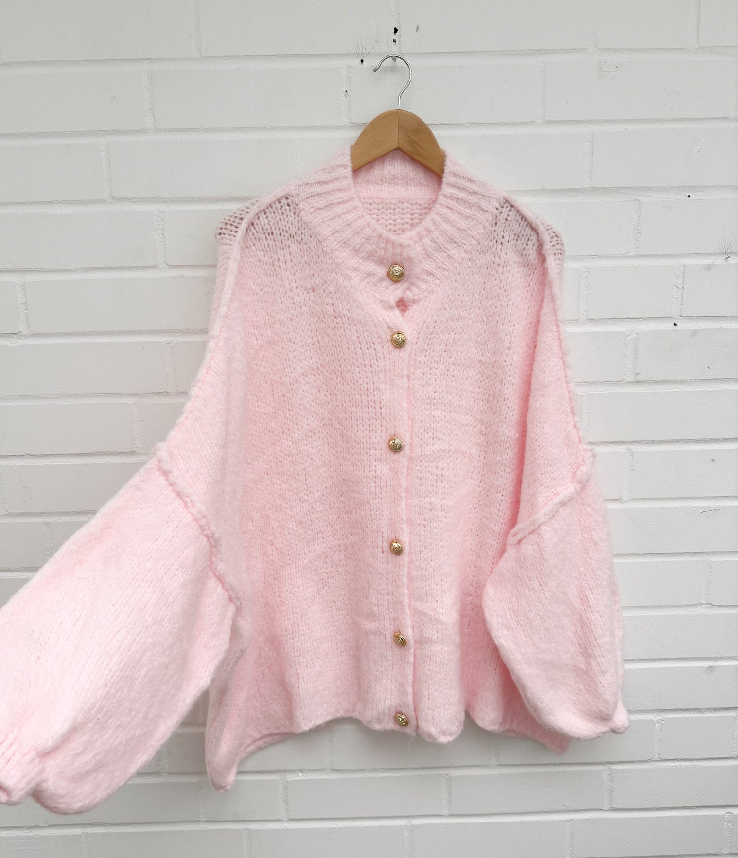 Lässige Oversize Strickjacke mit goldenen Knöpfen.Größe: Einheitsgröße, passt 36 bis 50Material: 38% Acrylic, 32% Polyamide, 18% Wolle, 12% Mohair