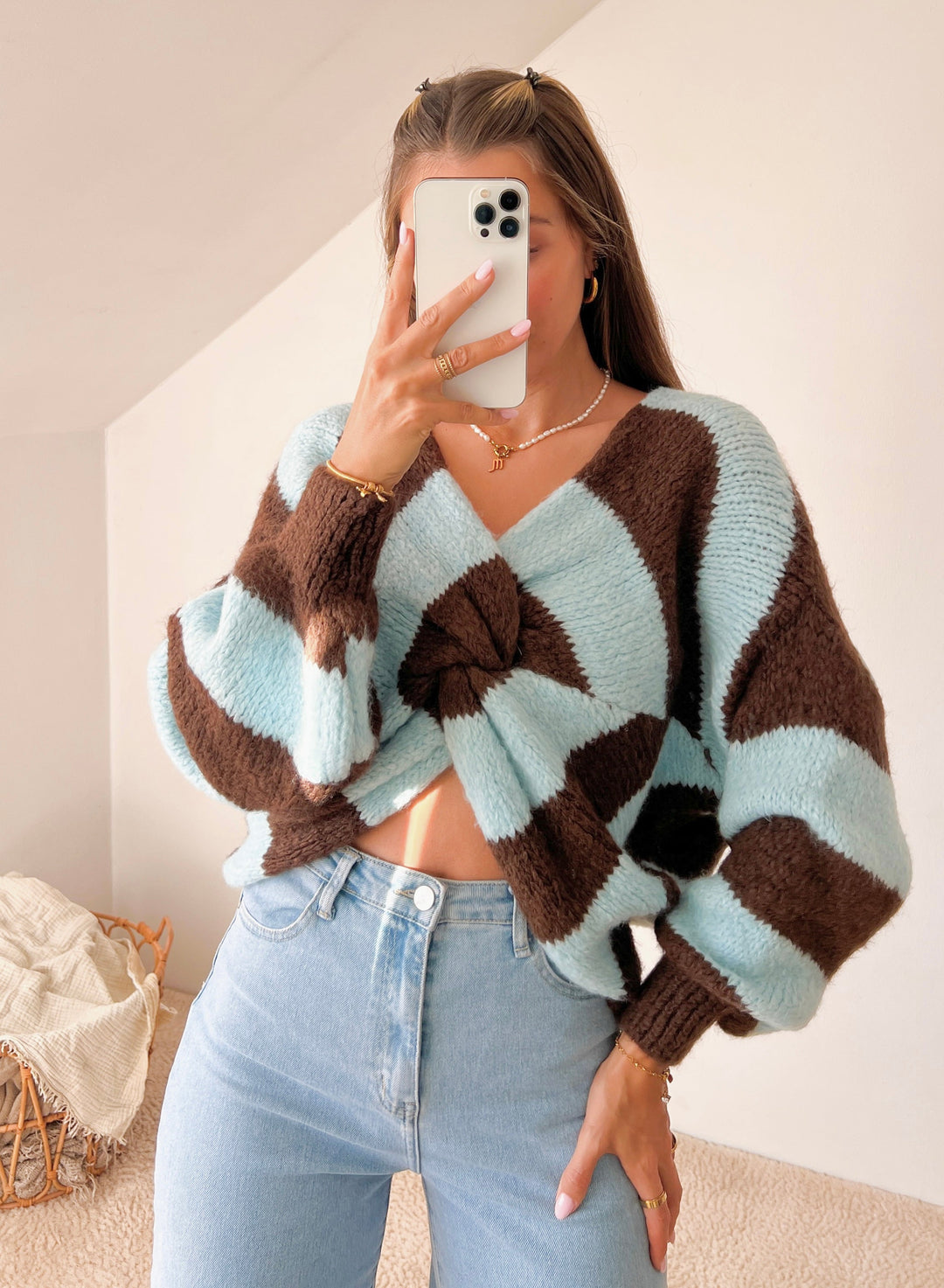 OVERSIZE STREIFEN STRICKPULLOVER - Hellblau braun